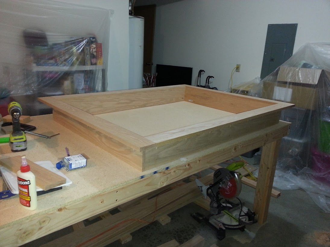 To completed the table he used a Miter Saw, Table Saw, Kreg Mini Pocket Jig, 2 clamps, 2 Drills, Electric sander and a bunch of patience. The interior is 53″ x 38.5″. With the top on, the table is 60″ x 45.5″. The Height is 31″ to the top and 24-3/4″ to the bottom of the sides. The game surface is a Micro Suade purchased from FashionFabricsClub.com and is great quality.