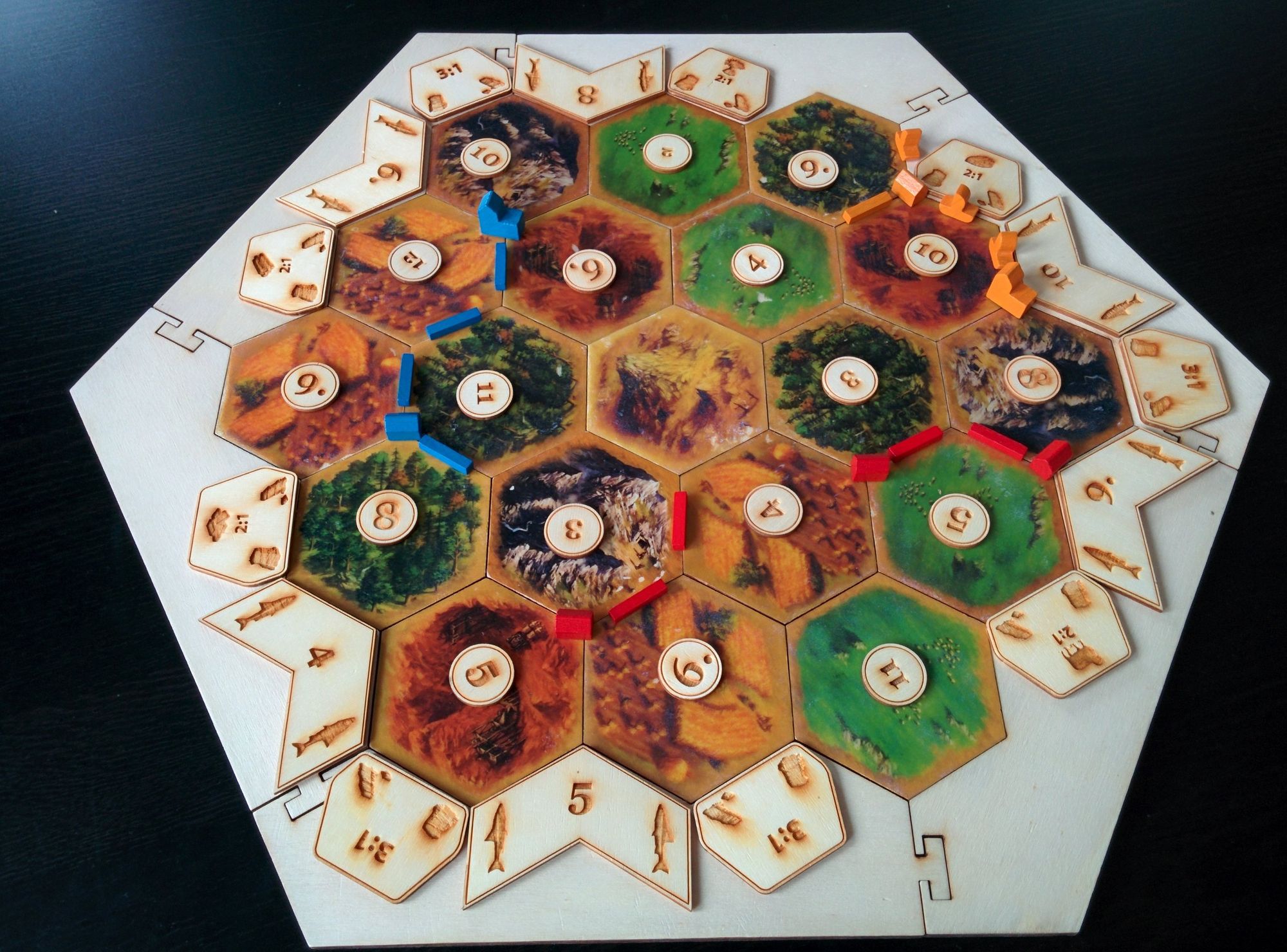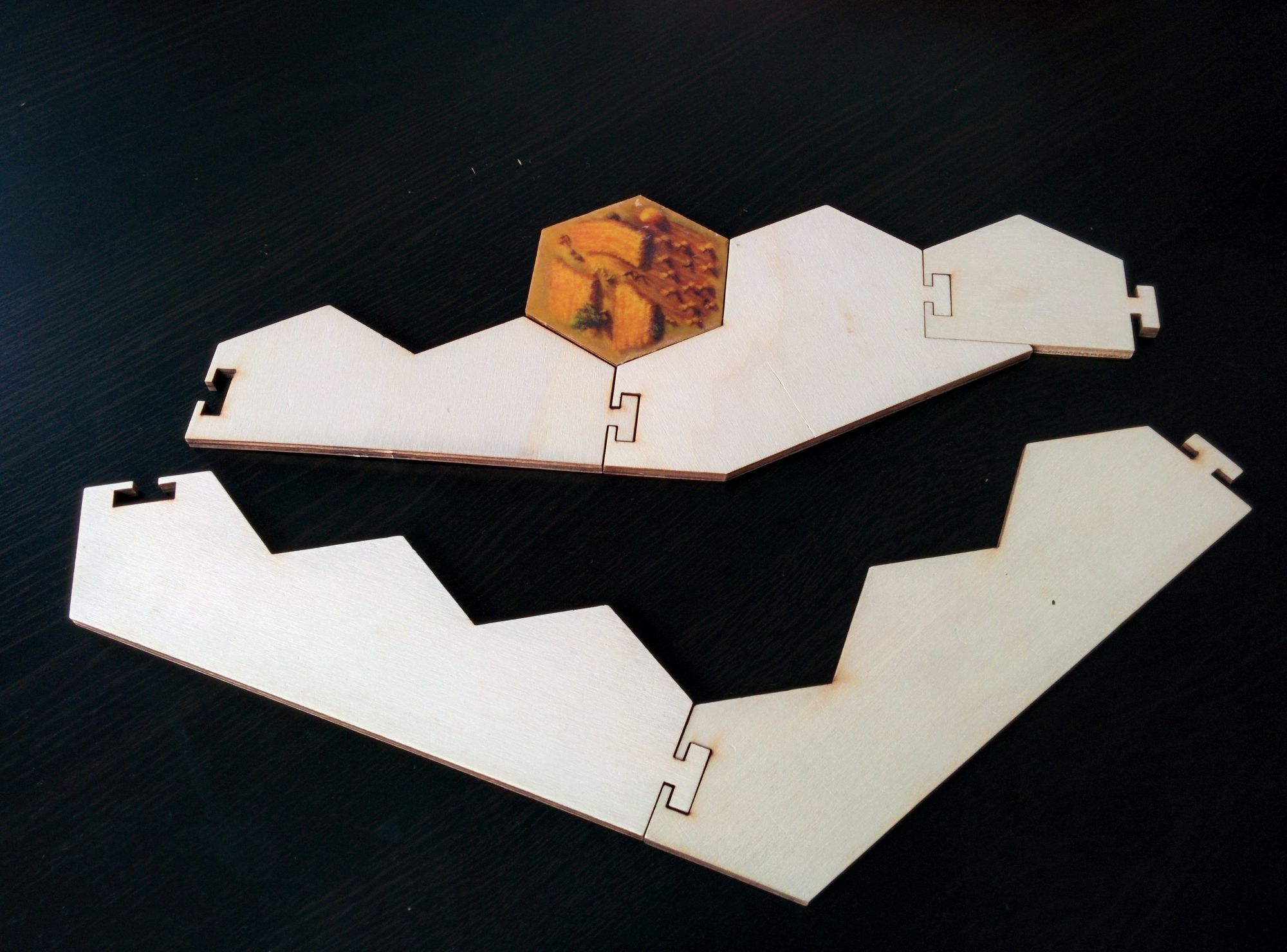 “I decided I wanted to make a wooden version of the game board. I thought a wooden board of catan would have a great look and feel to it and would fit perfectly into the style of the game and the buildable custom tile setup.