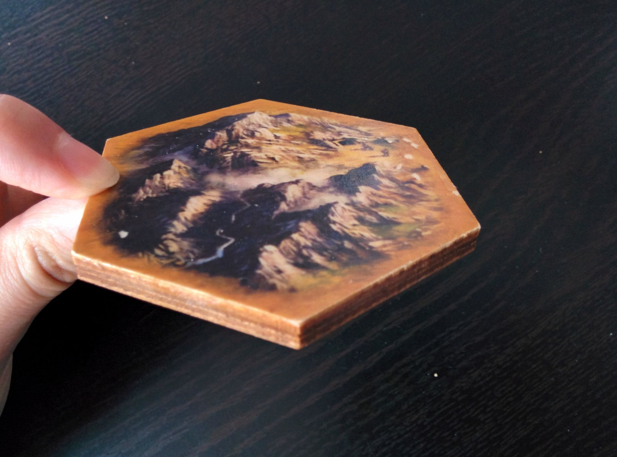That is why I set out on creating a wooden version of the Catan board that held on to the colorful graphic style of the original game. To achieve this I used a combination of mod podge and images printed on paper (google print on wood). The whole print process took a lot of time and and insane amount of patience, but I found out that the results were definitely worth it!”