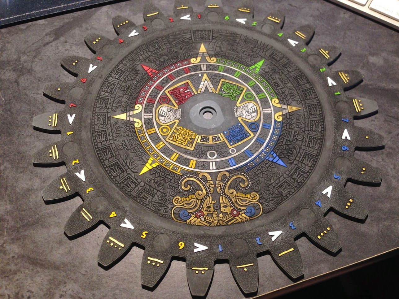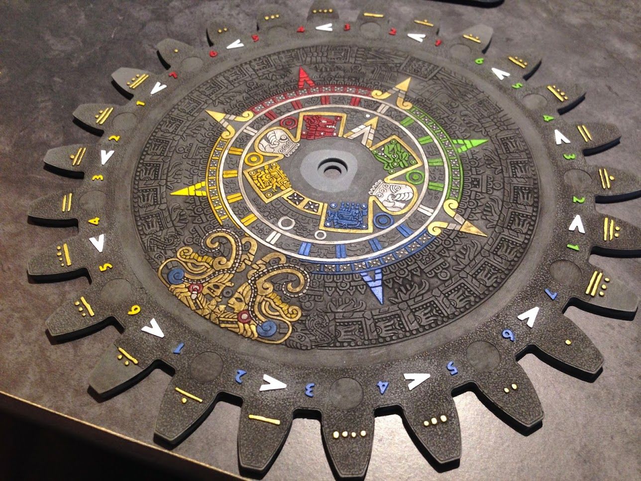 After playing Tzolk’in: The Mayan Calendar once, Robert knew two things: He really wanted to own the game and he absolutely needed to paint the gears immediately after purchasing it. His creation consists of the impeccably detailed center gear as well as solid colors for each of the secondary gears.