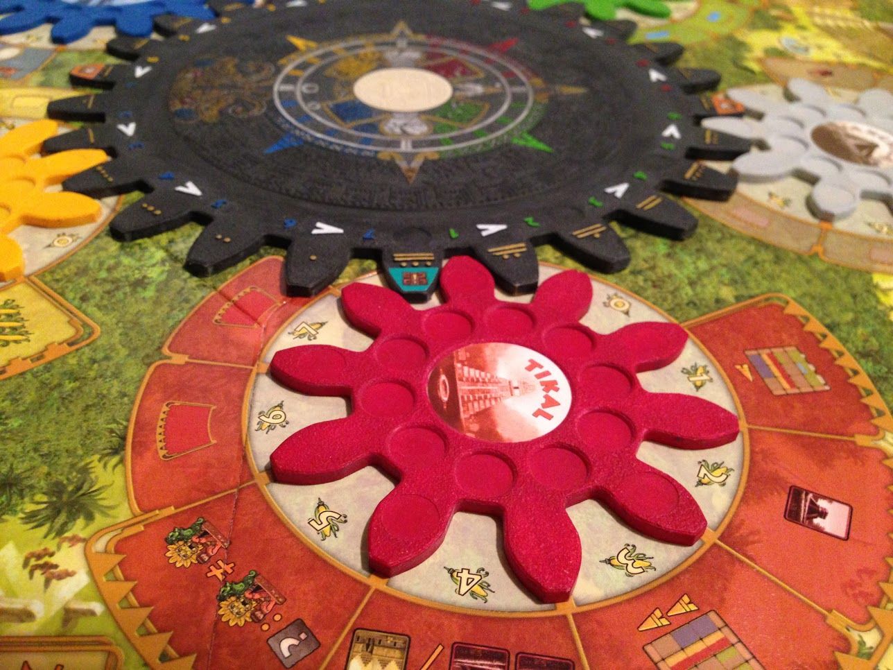 The game ends after one full revolution of the central Tzolkin gear. There are many paths to victory. Pleasing the gods by placing crystal skulls in deep caves or building many temples are just two of those many paths…