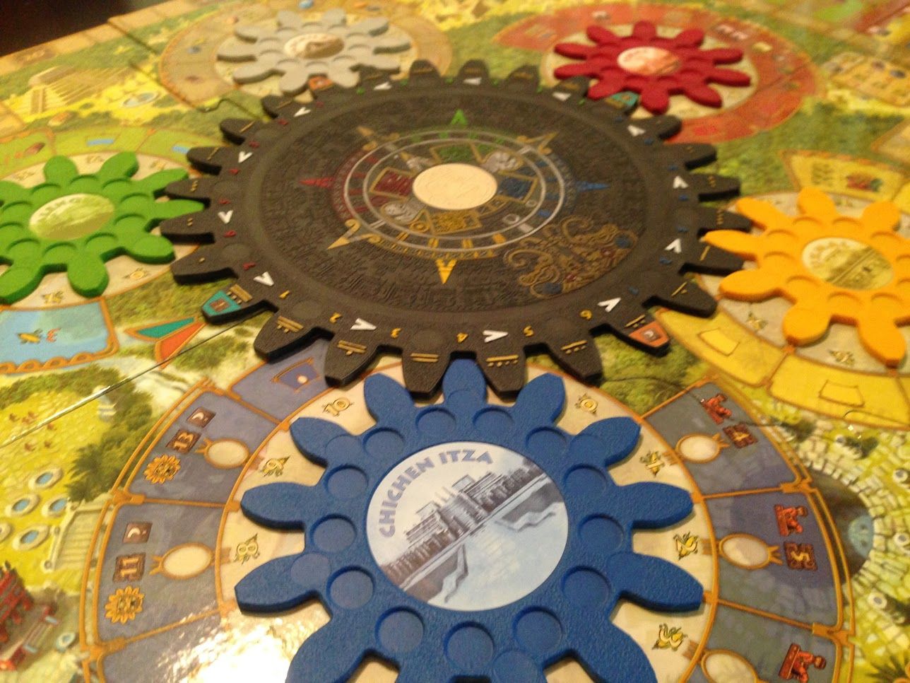 Tzolkin: The Mayan Calendar presents a new game mechanism: dynamic worker placement. Players representing different Mayan tribes place their workers on giant connected gears, and as the gears rotate they take the workers to different action spots.