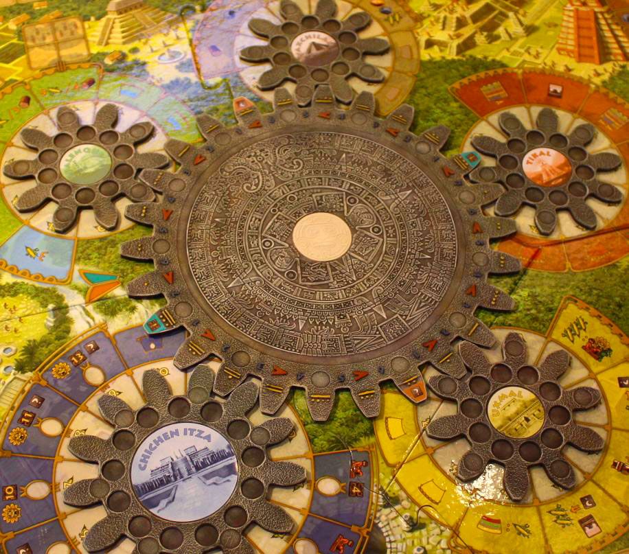 Tzolkin: The Mayan Calendar is a worker placement games with a dynamic mechanism. Players play as different Mayan tribes trying to please the gods. To do so each player must place their workers on giant connected gears. As the gears turn different actions are available to any workers who are removed from the gears.